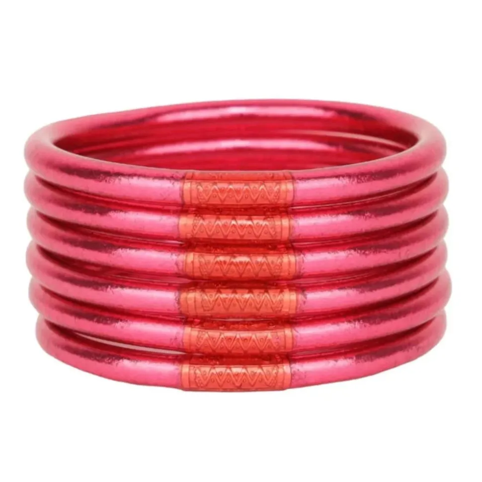 BDG Pink All Weather Bangles® (AWB®)! Our crazy-pretty peony pink bangle bracelets are fabulous as a bold fashion statement a la Schiaparelli or Saint Laurent. These amazing bangles are weightless, soundless, waterproof and TSA proof. Each of the six pink bangle bracelets in the set is meant to represent an intention for your day. As you put them on, affirm your intentions in the morning, and when you remove them in the evening, fill yourself with thoughts of gratefulness. This daily ritual will settle your mind at the beginning and end of each day. Pink All Weather Bangles are made of flexible, polyvinyl carbonate rings that are filled with gold leaf filament and sealed with our exclusive BuDhaGirl Serenity Prayer bead. This unique, non-metal material allows you to go from the pool, to the office, and through the airport all without needing to take them off.