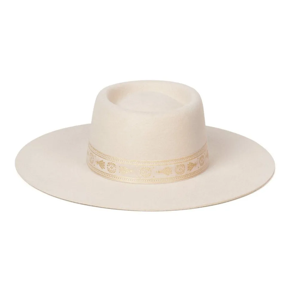 The boater style that is an LOC favourite. Featuring an oval, dipped crown design, this chic cream boater is trimmed with vintage golden dragon fly ribbon.