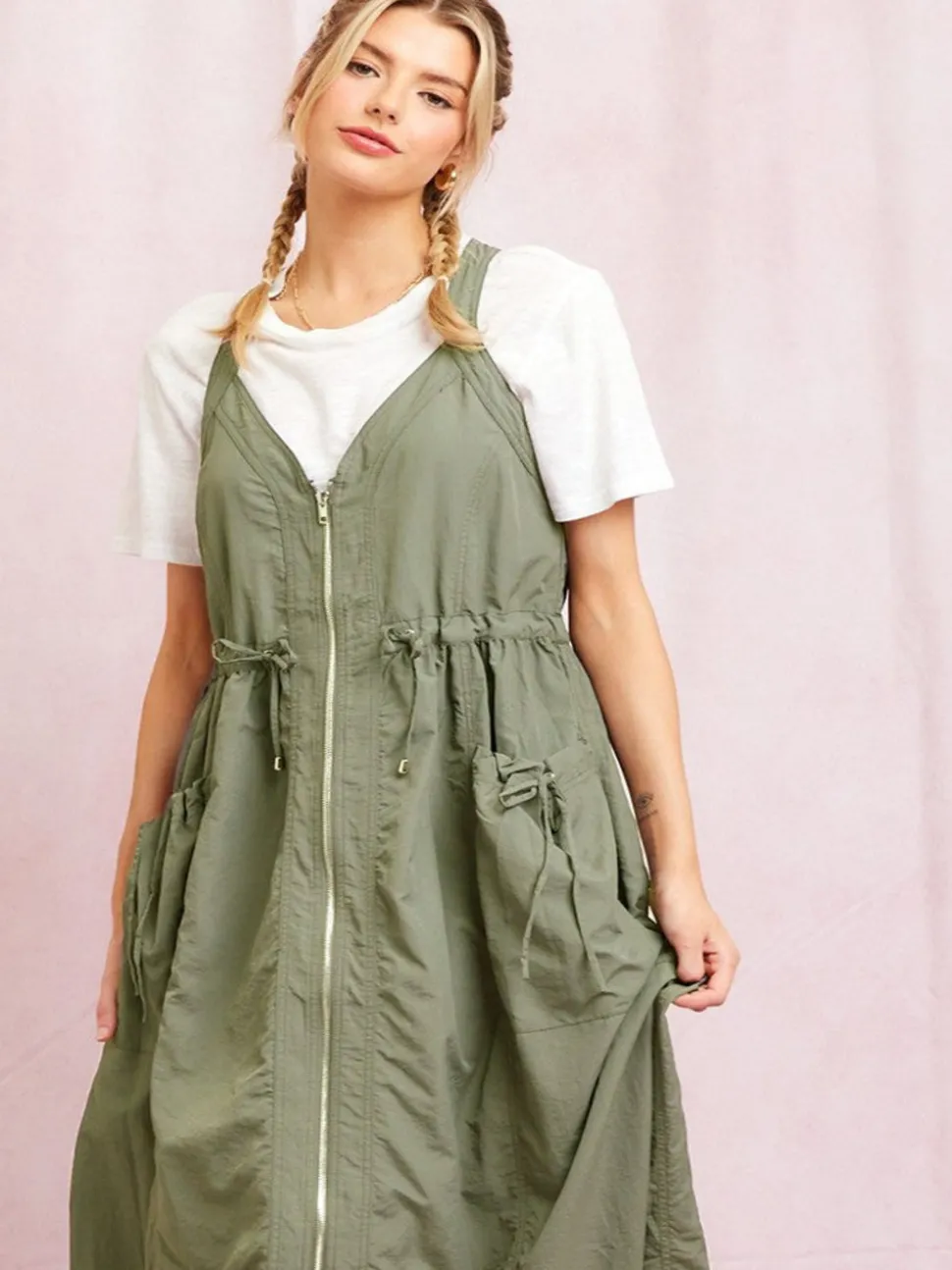 Unleash your inner cool with our Cargo Flowy Zip Midi Dress in olive! This versatile dress features a zip front for effortless style and a flowy silhouette for maximum comfort. Perfect for any occasion, this dress is an absolute must-have for your wardrobe!
