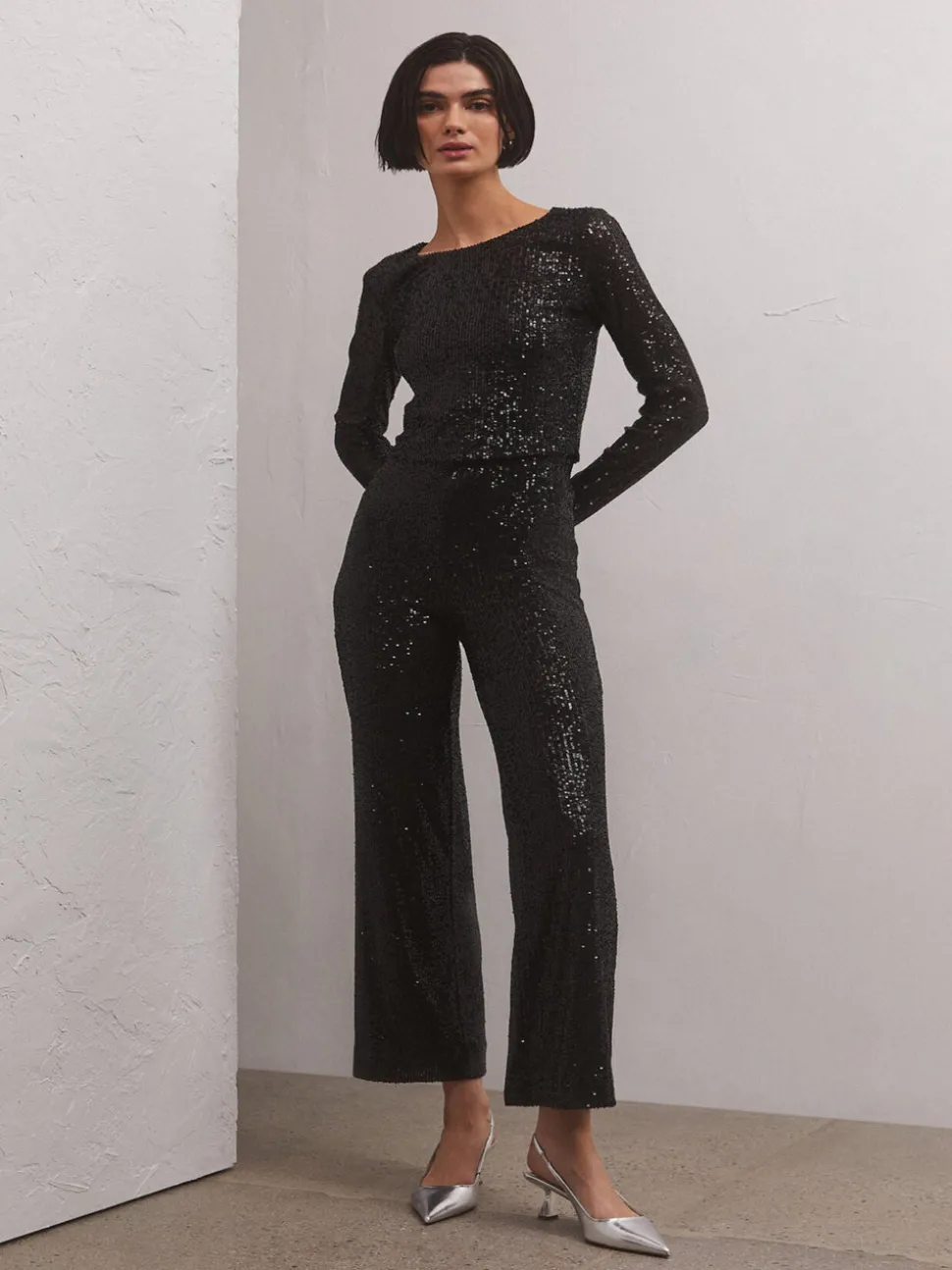 Shine bright in the wide leg Skylar Sequin Pant. Made using our bright Stretch Sequin fabric, this elastic, pull-on pant has a high rise, relaxed fit you’ll reach for when you want a touch of glam. Fabric Content: 92% Polyester 8% Spandex